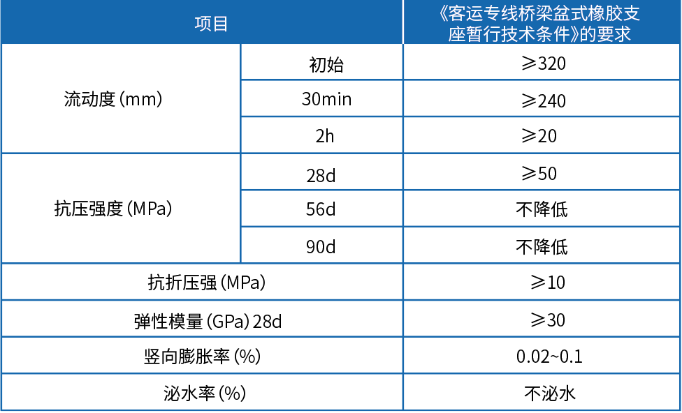 支座灌漿料是一種高性能改性水泥基灌漿材料,采用了多種有機、無機添加劑,具有早強咼強、無收縮、耐久性能好等特性。該產品具有很好的施工性能,能夠自流找平,可操作時間長,且完工後表麵光滑平整,克服了傳統砂漿所產生的不平整、易開裂、剝落、起粉等缺點,其性能完全滿足《客運專線橋梁盆式橡膠支座暫行技術條件》的要求。