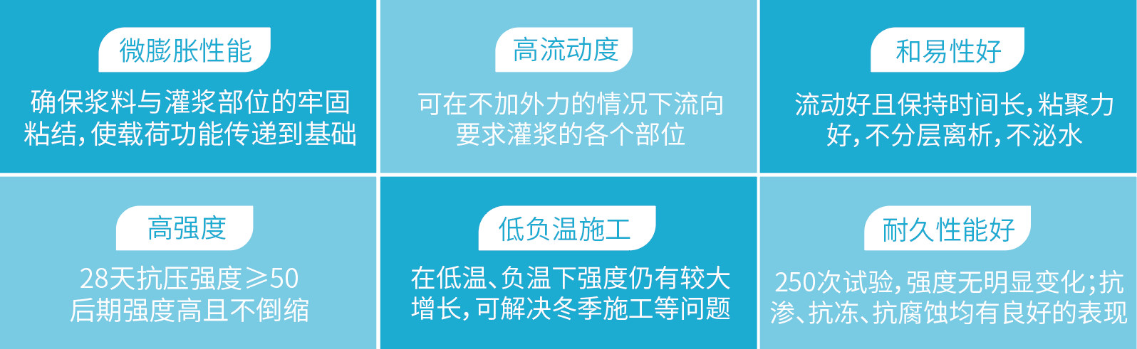 適合於搶修、支座錨固,大型設備和精密設備地腳螺栓與機座的二次灌漿,鋼結構與混凝土固結的二次灌漿,梁、柱二次加固等,特別適用於高速鐵路、客運專線、高速公路橋梁的支座灌漿,其性能指標滿足《客運專線橋梁盆式橡膠支座暫行技術條件》和《客運專線橋梁圓柱麵鋼支座暫行技術條件》的技術要求。